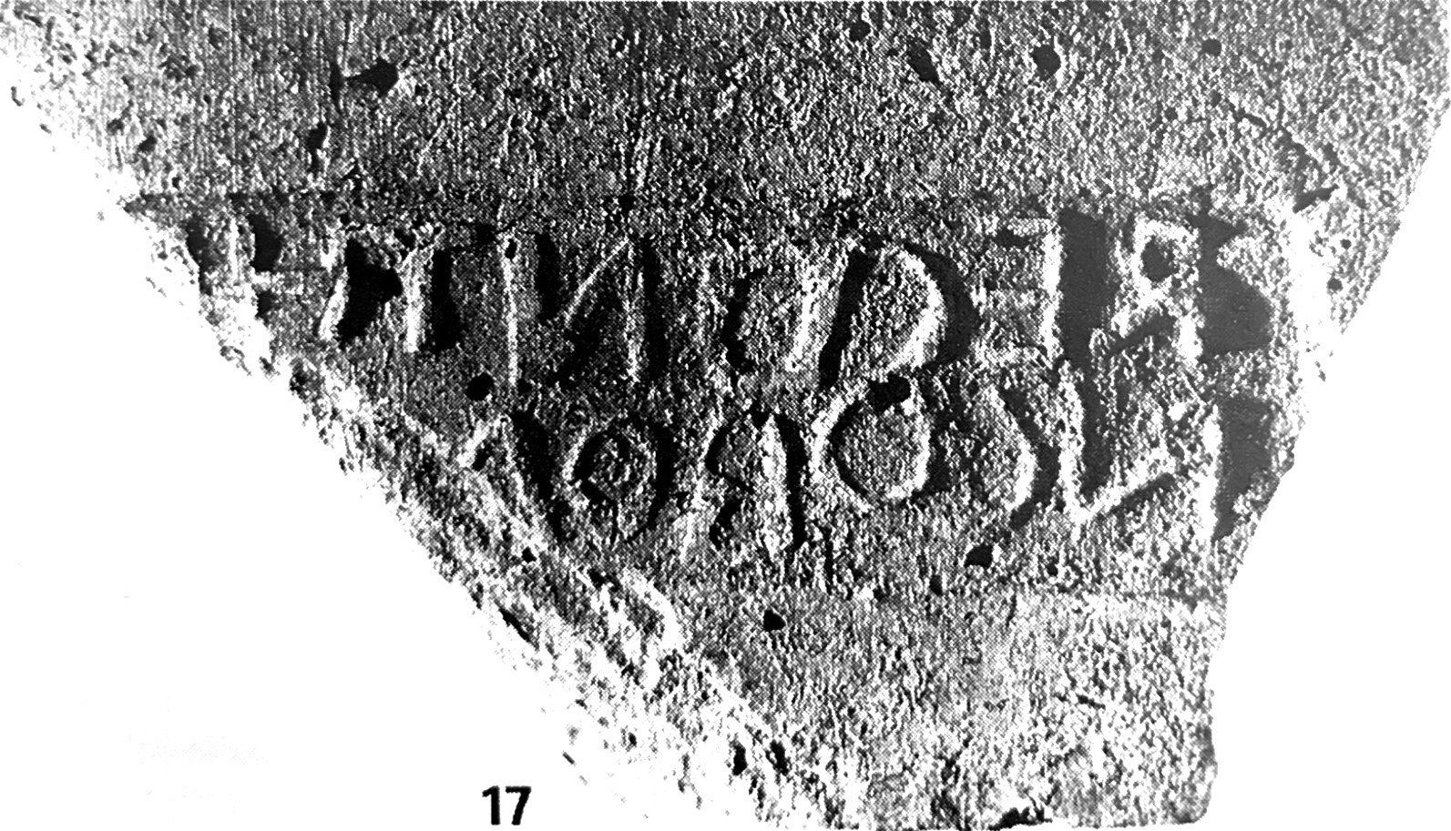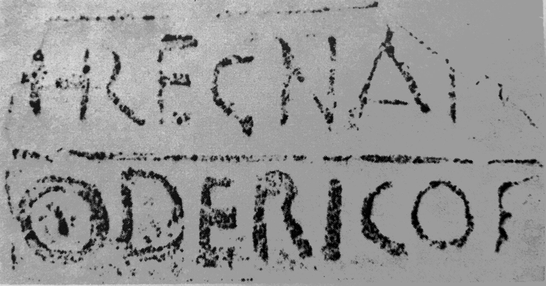 Commenti. Felle identifica il bollo con punto interrogativo; in effetti esso non corrisponde all'unico es. attualmente noto di CIL XV 1547. La grafia indirizza la ricerca nell'ambito tardo-antico. La trascrizione basata sulla piccola fotografia è incerta – potrebbe trattarsi di numerali, in r. 1 retrogrado.