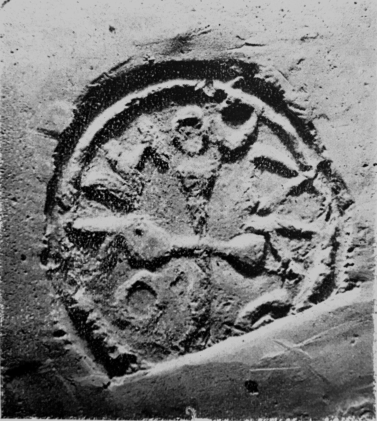 Paleografia. Righe dritte, testo retrogrado all'interno di un cerchio in rilievo.