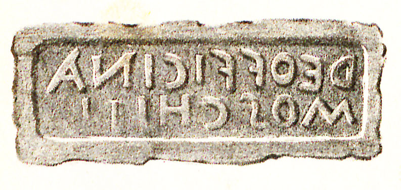 Commenti. "The elaborate form of the crossbar of the A, and the generally decorative appearance of the stamp, suggest a date after Diocletian", Anderson. Il bollo non è illustrato; il giudizio rimane sospeso.
