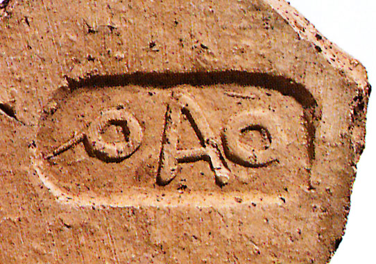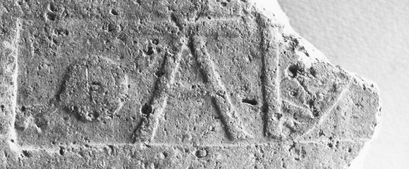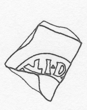 Commenti. Rodríguez Almeida legge ///D. A.///, Arxé Gálvez come sopra. Mancherebbe l'asta trasversale della A, il che accade spesso, ma si può pensare all'alternativa di girare il bollo è leggerlo con testo retrogrado, D. V( ) [---]. Rinvenuto sul lato E del temenos di Gabii.