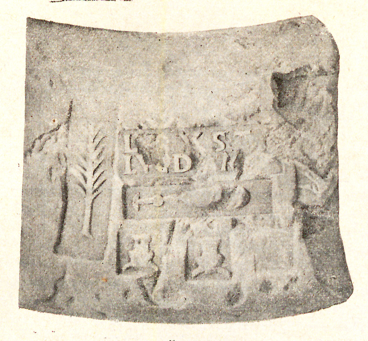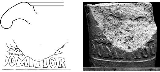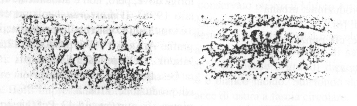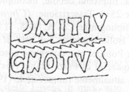 Commenti. Il labbro di dolio è stato smarrito. Rimangono dubbi sulla posizione del "ramo" che sormonta il testo (probabilmente un ramo di palma in bollo separato) e anche sulla prima lettera conservata, che forse è una M.