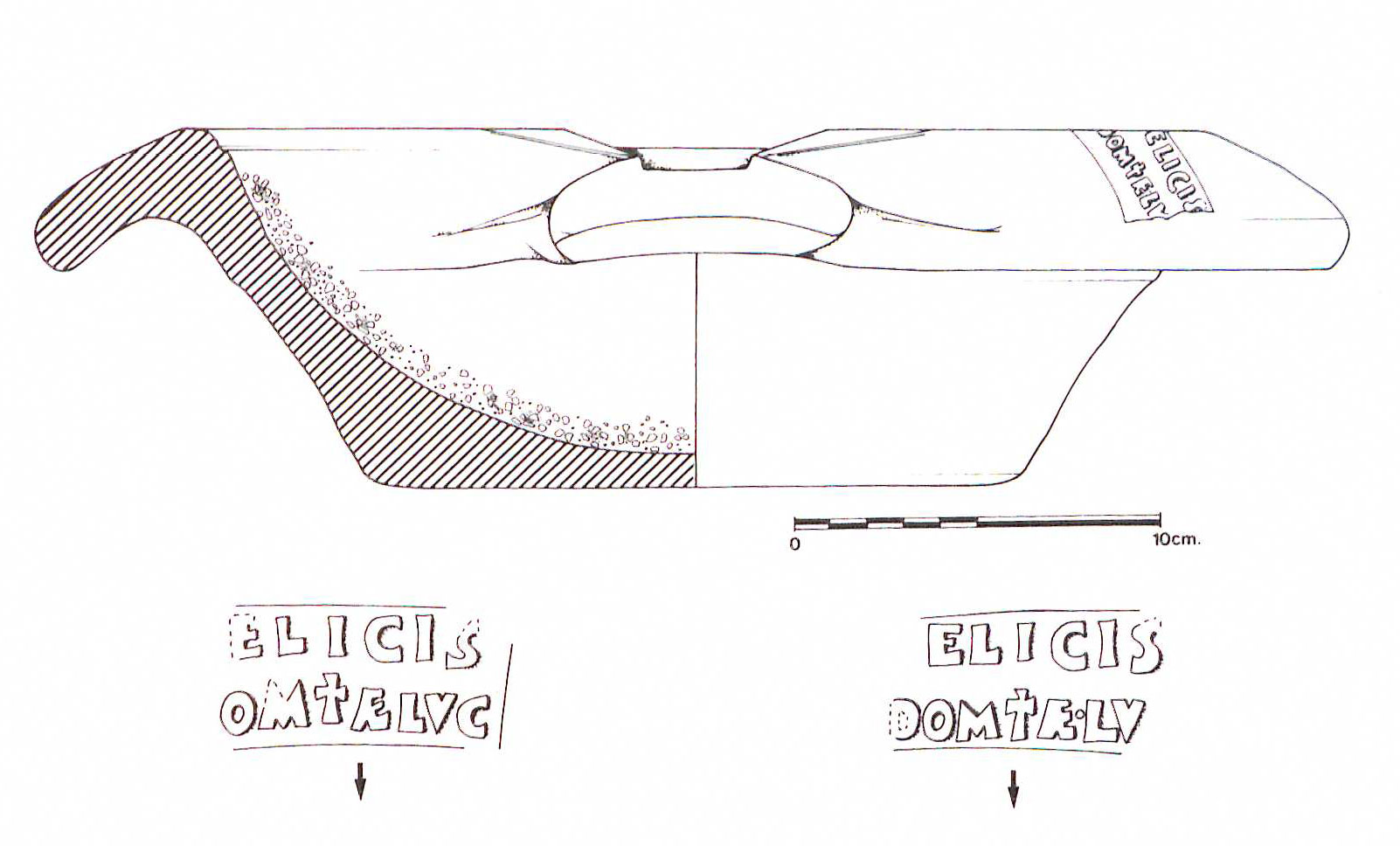 Commenti. Bollo noto solo da due doli dall'Esquilino. Sulla forma, rara su ceramica pesante Taglietti 2015, 269 con n. 10.