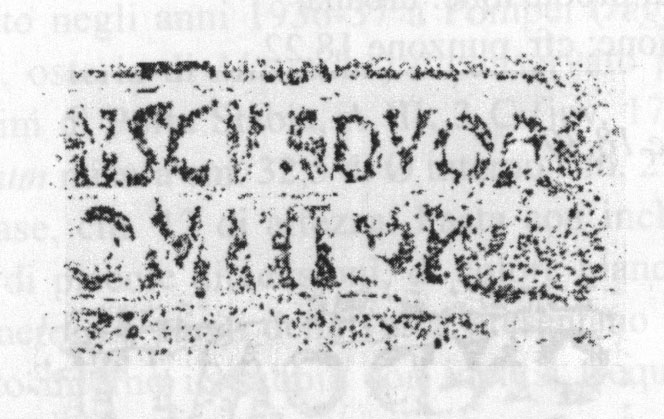 Commenti. La G non trova confronti nel nostro repertorio. Si tratta forse di un elemento di tria nomina abbreviati agli iniziali. S. Tortorella commenta: Il fatto che la lettera figuri a fianco della cuspide del tirso di destra farebbe pensare che si tratti dell'ultima lettera di tre: in questo caso [---]G, ma resta il dubbio.