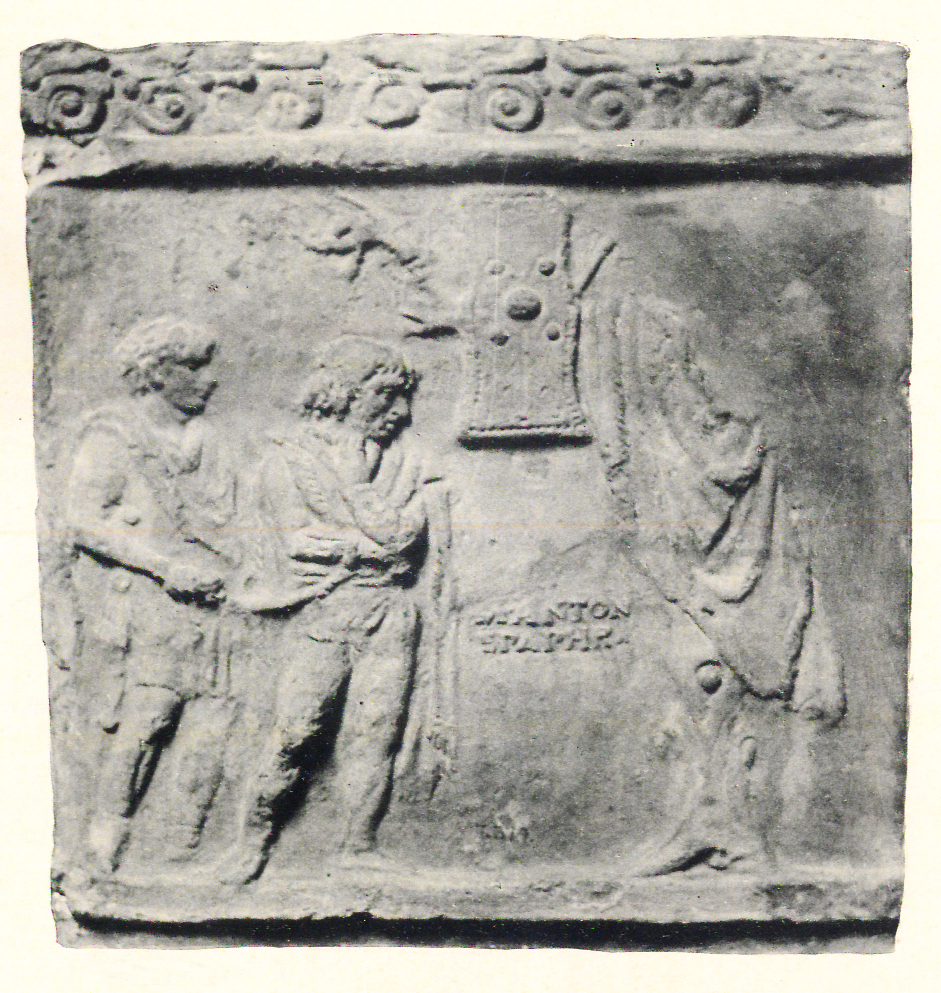 b) Pan, maenas, satyrus saltantes, a parte dextra mulier tibiis canens (von Rohden - Winnefeld 1911, 21 fig. 6). Cum his duobus laterculis a Campana componitur laterculus latior quam altior, in quo inter encarpa quernea est os Bacchi inter ora Panis et Sileni. Campana, Antiche opere in plastica, tav. XXXVI-XXXVIII (Parigi); Cataloghi del museo Campana, classe IV, 12 Nn. 254-259. Sia le lastre grandi che la più piccola sono timbrati.