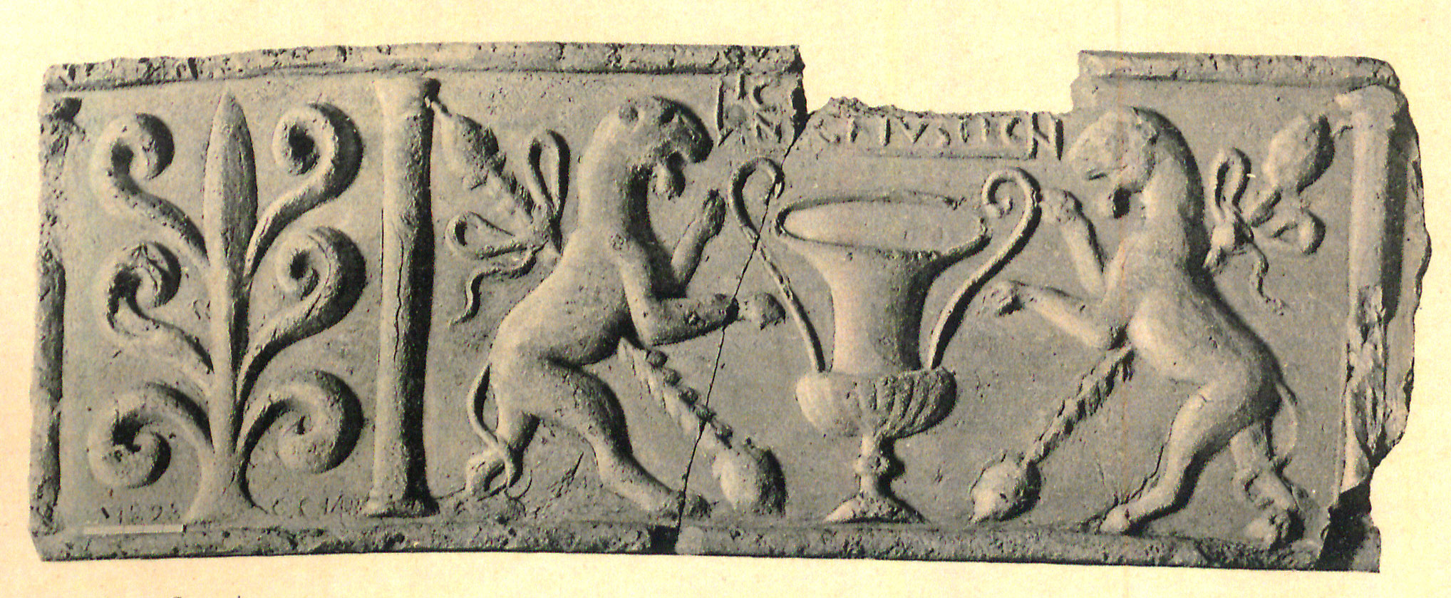 Paleografia. La lettera è stata accuratamente incisa nella matrice subito sotto il bordo della lastra, a fianco della cuspide del tirso della metà destra della scena (due pantere rampanti ai lati di un kantharos).