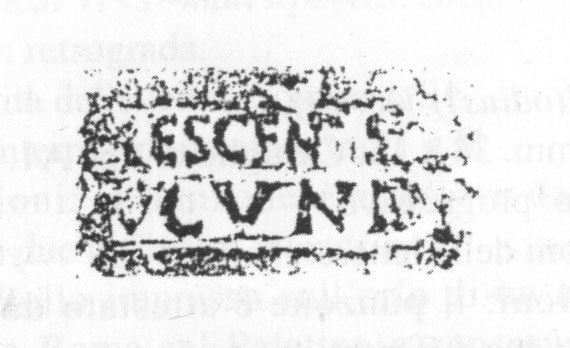 Edizioni. Hartley 1973, 53 N. 37 (m., Arles). Fernández Izquierdo 1980, 181 N. 1, fig. 12 a p. 180. J.M. Blásquez Martínez, in Producción y comercio del aceite en la Antigüedad. Secundo Congreso Internacional II. Universidad Complutense. Madrid 1983, 75 fig. 24 da J. Blásquez; Ramos - Wagner - Fernandez 1984, 153 e fig. 13a a p. 150, tav. II.2; Pérez González - Fernández Ibánez 1989, 80 N. 15, fig. 15; Parker 1992, 71 N. 98 (m., relitto Ben Alfeli, Almazora). Hartley 1973, 52 N. 38; Ramos - Wagner - Fernandez 1984, 158 (m., Nijmegen). Pallecchi 2002, 181 punzone 21.1 Nn. 226, 227a/b, 228; 294 N. 461 (m., Saint-Raphaël; Brentchaloff - Rivet 2000, 496s., 500 N. 16 con lettura fantasiosa). Aguarod Otal 2022, 334 Nn. 40-41, fig. 8.40-41.