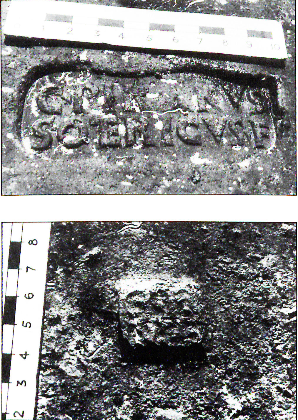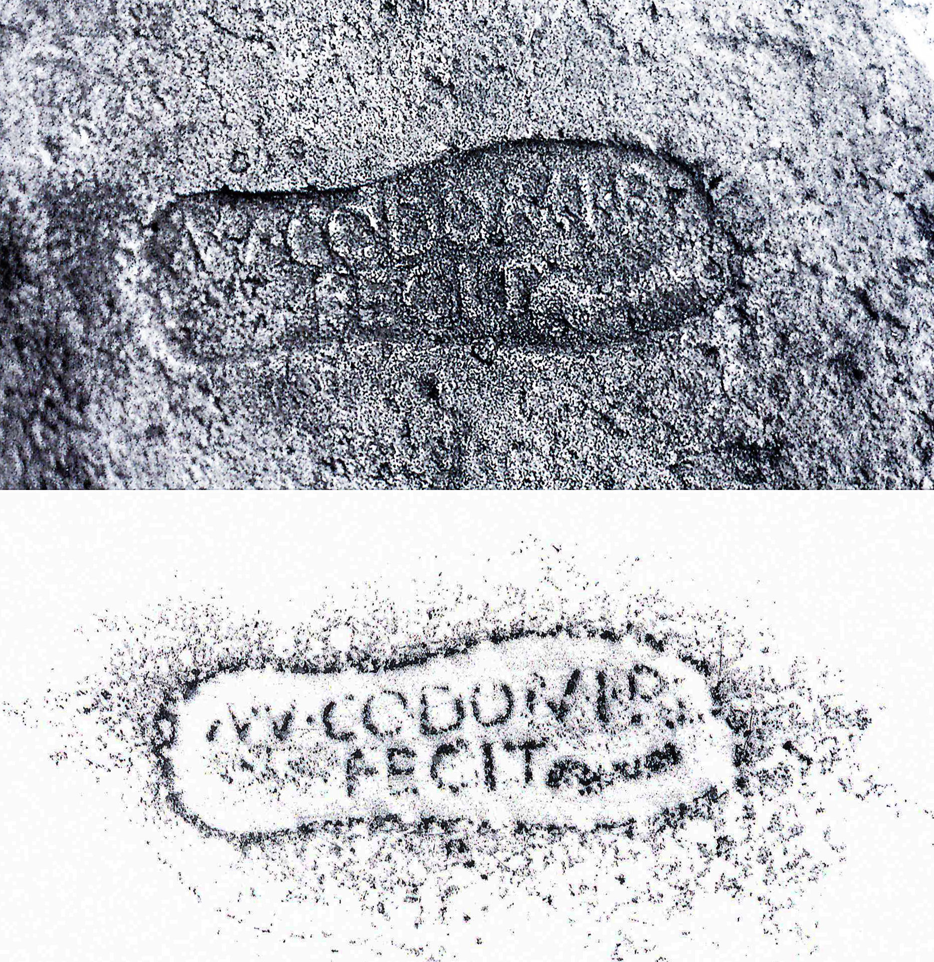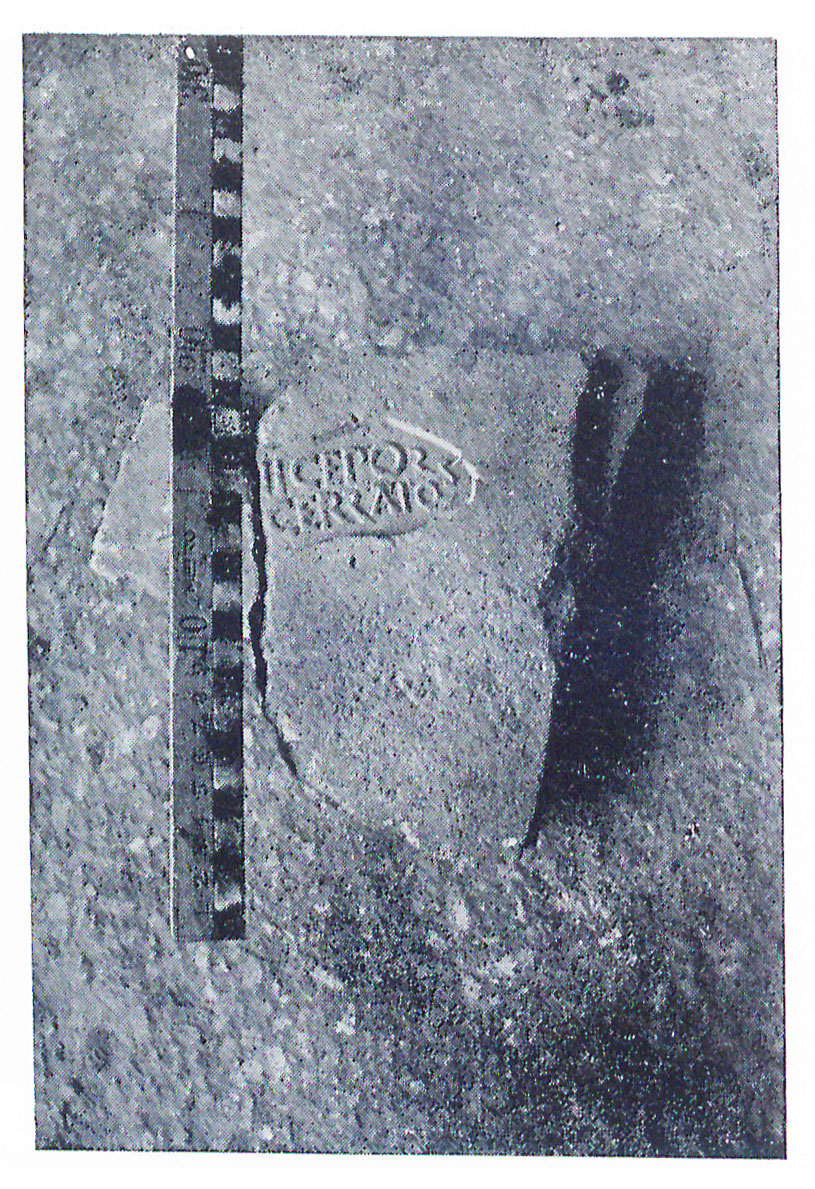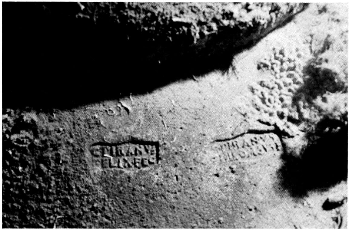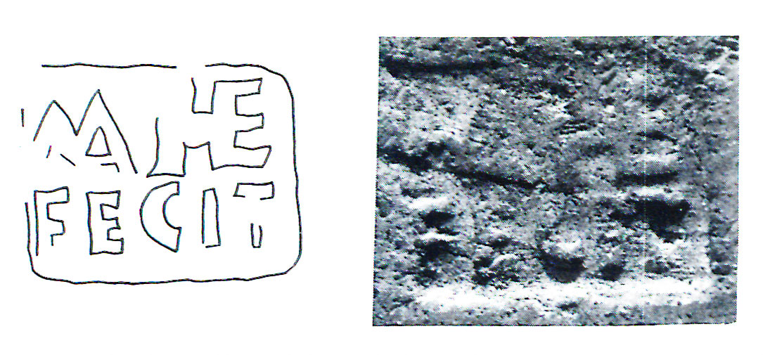Edizioni. Pallares 1983, 84s. N. 4, figg. 59-61 (forma "non perfettamente rettangolare"; secondo bollo forma 110 con una sola riga di testo, TI). Pallares 1983, 86s. N. 5, figg. 62-64, forma rettangolare, fra le righe motivo a cordicella, r. 2 [---]'D'I'G M[---].