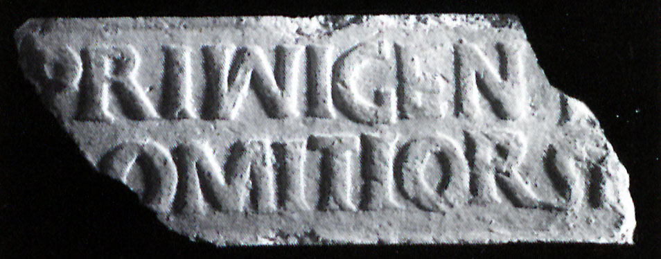 Paleografia. R. 1, PRIM^IGEN CIL VIII 22632.75, CIL X 8046.24, Steinby 1981; la trascrizione in LSO riporta il nesso N^I che non si distingue nella fotografia e che non compare nel disegno di Lugli, dove è invece segnato un punto ·DVO. Invece nella trascrizione di Zucca il nesso N^I compare. Gatta riprende l'argomento aggiungendo l'informazione che il nesso non compare negli esemplari dei Musei Vaticani da lei visti. - La linea fra le due righe notata da Dressel, Pfeiffer - Van Buren - Armstrong 1905 e v. Hesberg è in realtà un tratto irregolare causato da una fenditura del timbro ligneo (LSO, Steinby 1981, cfr. Lugli). I punti, piccoli e poco incisi, mancano in molte impronte, ma si tratta sempre dello stesso timbro (misure e posizione delle lettere).