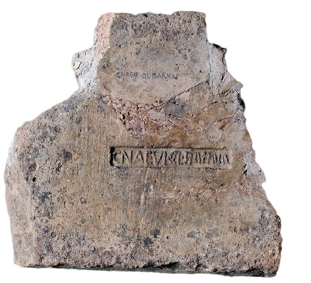 Commenti. Il testo è stato male composto e quindi alla fine della riga rimane uno spazio vuoto, solo parzialmente colmato da una palmetta obliqua verso destra. Negli esemplari del Palatino si nota una larga fenditura, di cui un tratto interessa la fine della riga, a destra della palmetta. Pare che proprio la palmetta e la fenditura siano state interpretate come lettere (FL, DL o FE), creandosi così la variante CIL XV 1345 (Q OPPI NATALIS·FL) (Steinby 1974, 93).