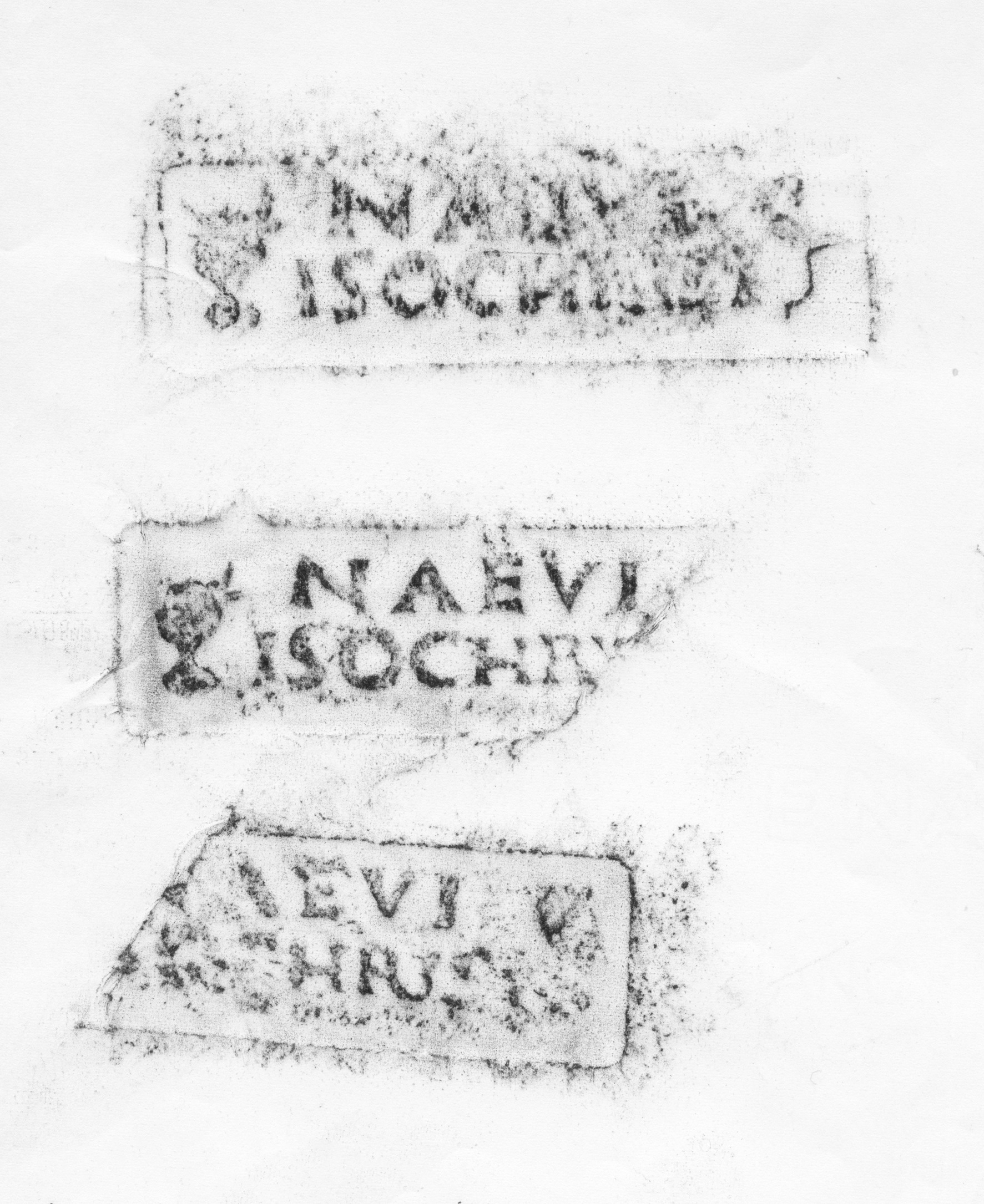 Commenti. Bloch 1948, 33: ISC. vel Isc. (?). Il bollo compare con la data a. 141 nell'elenco dei bolli rinvenuti in situ nelle Schola del Traiano, Aubry 2018, 274 tab. 1.