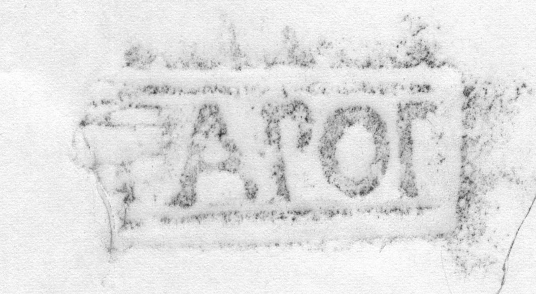Datazione. "Probabilmente fatto con uno stampo di metallo, il che potrebbe suggerire come datazione sia il I sec. che il periodo post-dioclezianeo. La prima ipotesi è più probabile sia a causa della forma della A che della proporzione dei bolli del I sec. rinvenuti nello stesso punto." (Coste).