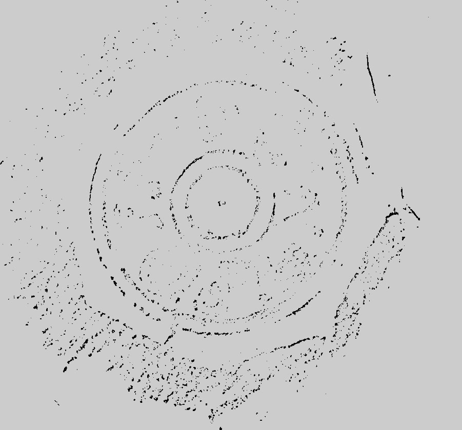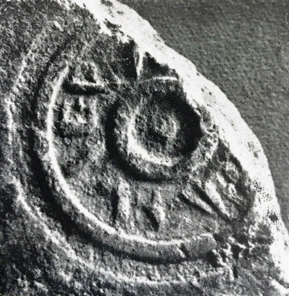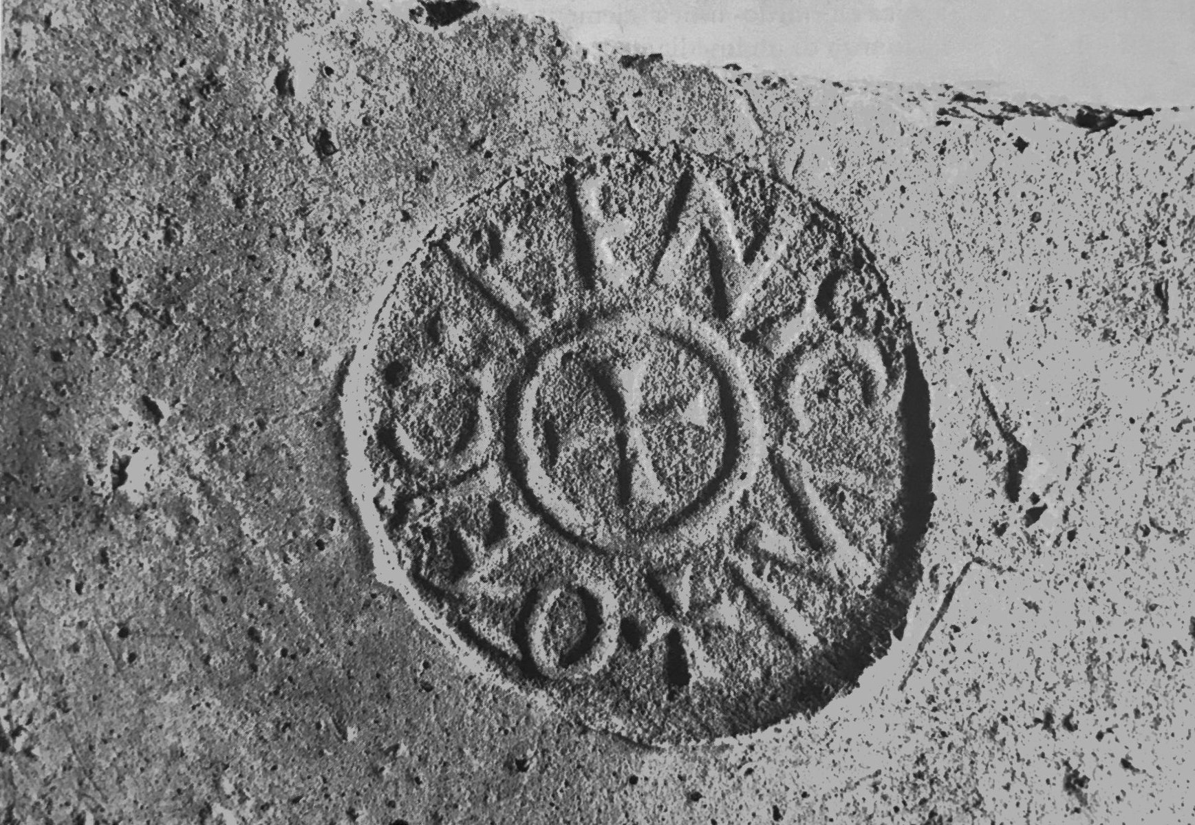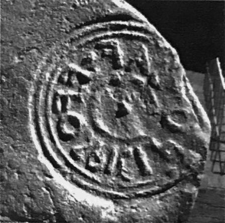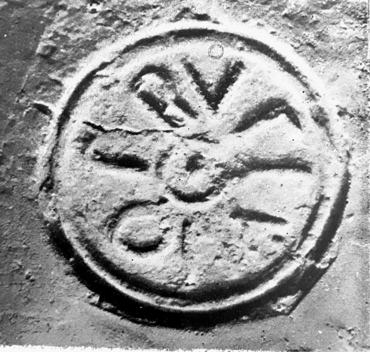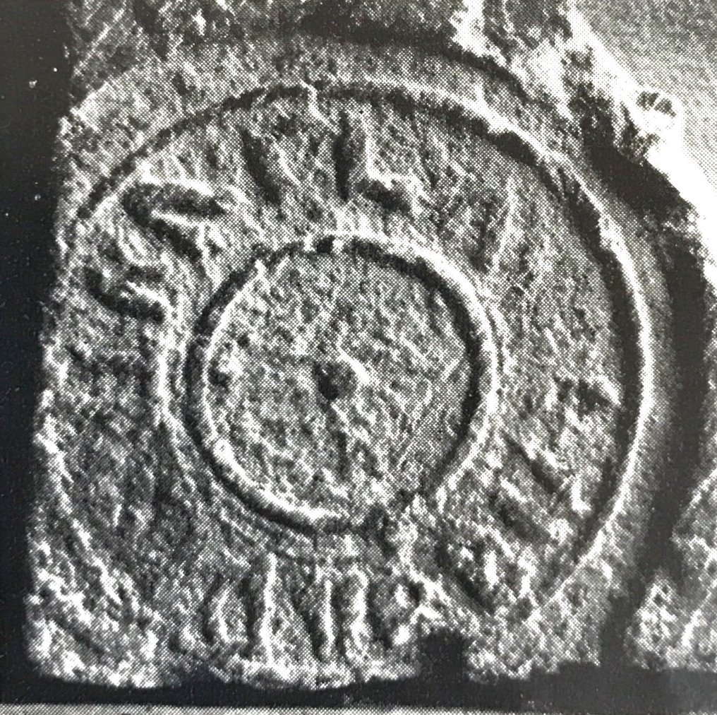 Paleografia. Righe dritte, testo retrogrado all'interno di un cerchio in rilievo.