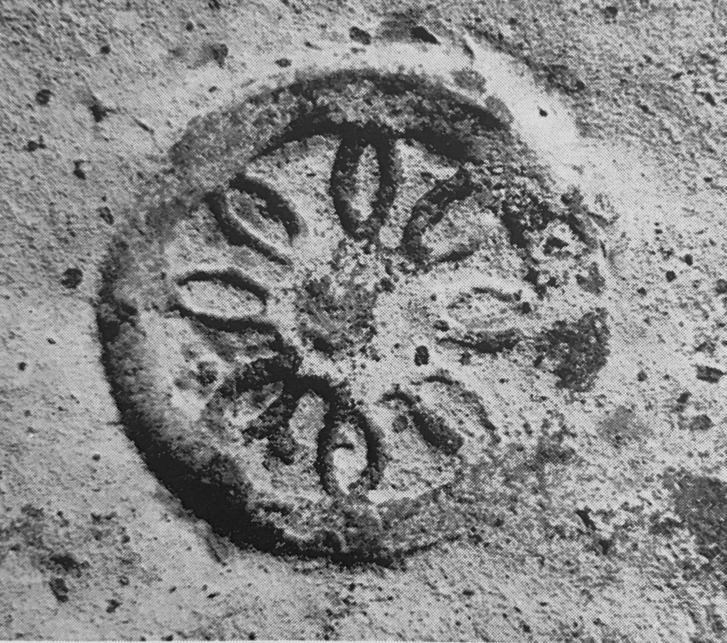 Bollo circolare con impresso un ornamento a forma di petali di un fiore, disegnati con tratti incavati. 15 esemplari dal tetto di S. Maria Maggiore; sulla base della forma delle tegole (VII C) databile in età teodericiana.