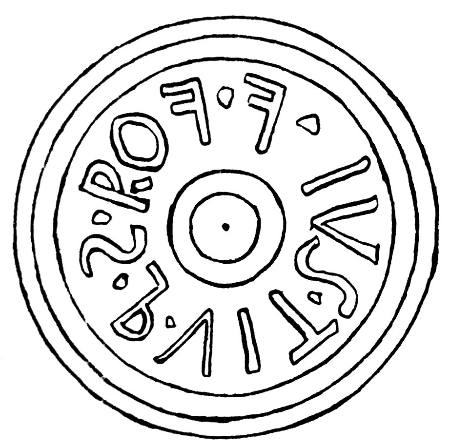 Paleografia. Bollo non perfettamente circolare. Righe dritte, lettere pessime Dressel. Testo retrogrado. r. 2 capovolta.