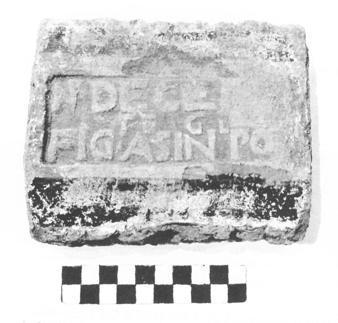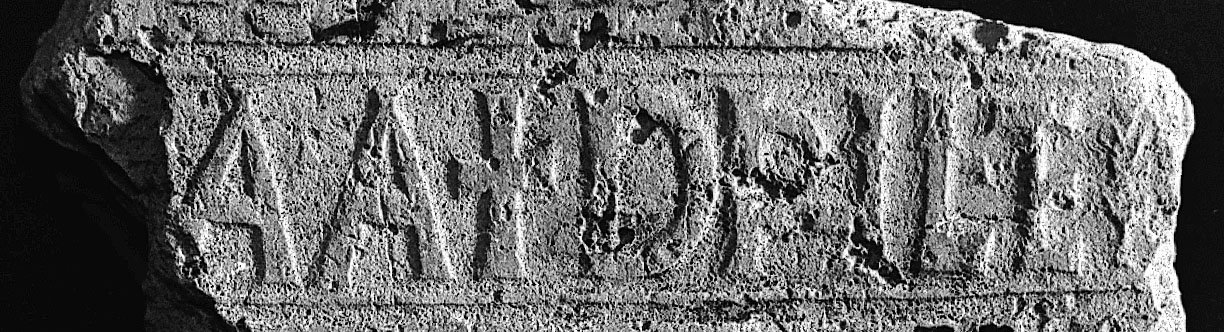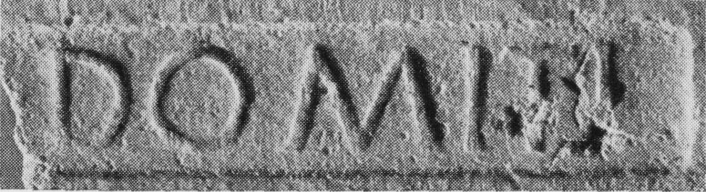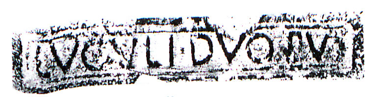Commenti. Rodríguez Almeida legge ///D. A.///, Arxé Gálvez come sopra. Mancherebbe l'asta trasversale della A, il che accade spesso, ma si può pensare all'alternativa di girare il bollo è leggerlo con testo retrogrado, D. V( ) [---]. Rinvenuto sul lato E del temenos di Gabii.