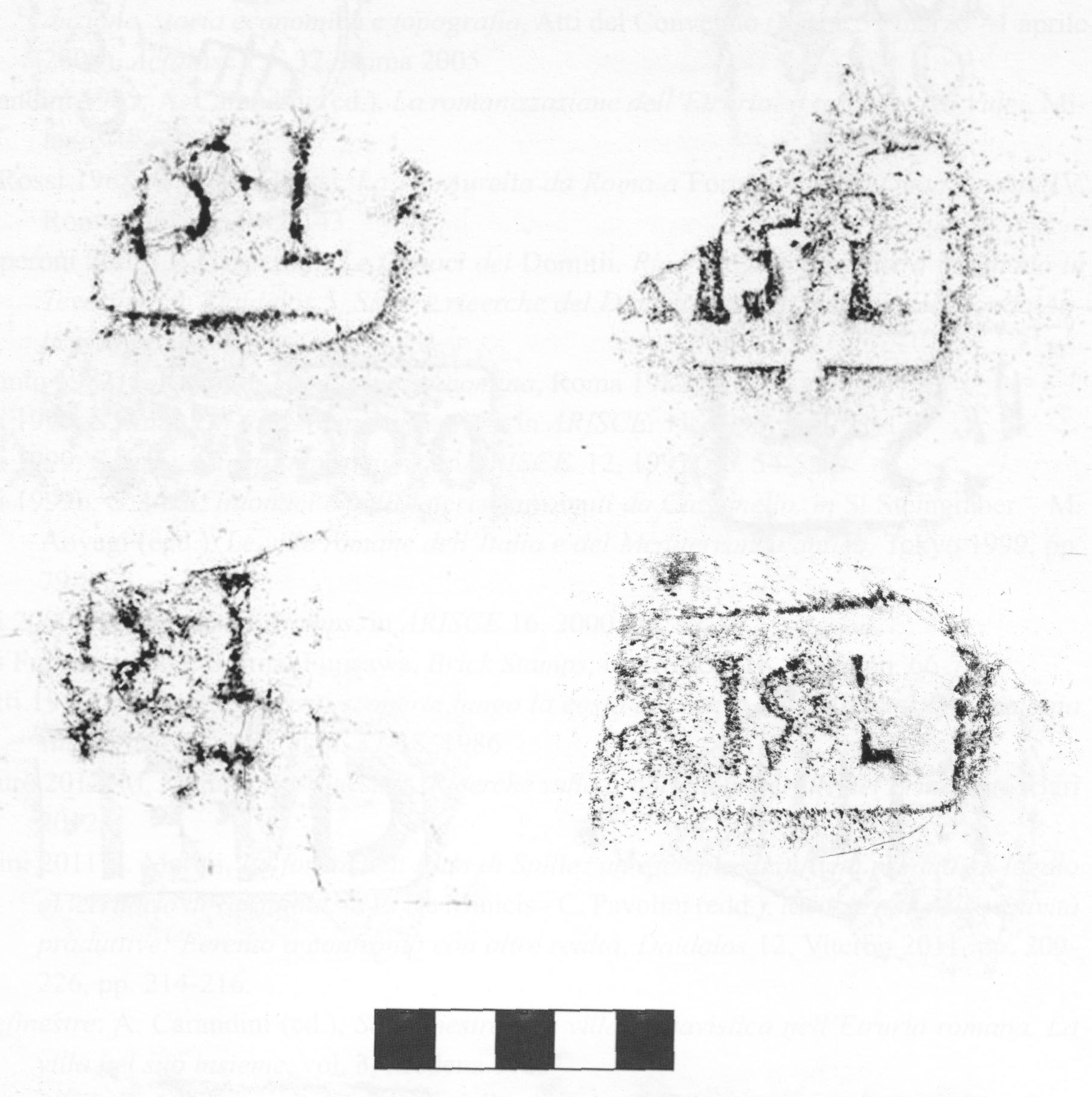 Edizioni. E. Berggren, in S. Quilici Gigli, Blera. Topografia antica della città e del territorio. Mainz 1976, 145-154, bollo fig. 249 (2 frr.). Imai 1995, 133s., fig. 25.4, tav. 23.4. Imai 1997, 54s. fig. 15.3, tav. 18.3. Imai 1999.1, 46, tav. 15.9. Imai 1999.2, 80-82 figg. 4-5. Corsi 2000, 258s. n. 76, figg. 21-22. E.A. Stanco, in A. Maffei (a cura di), Cento anni di ricerche per la ricostruzione dei paesaggi culturali e per la redazione della carta archeologica dell'Arco del Mignone. Civitavecchia 2012, 221s. N. 20.1.