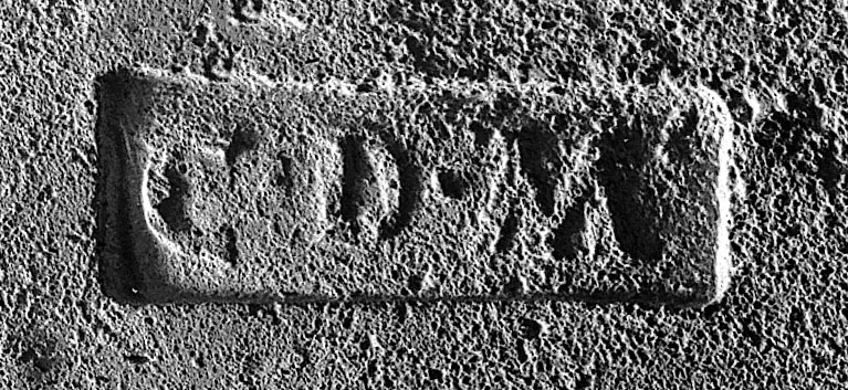 Commenti. Rodríguez Almeida legge ///D. A.///, Arxé Gálvez come sopra. Mancherebbe l'asta trasversale della A, il che accade spesso, ma si può pensare all'alternativa di girare il bollo è leggerlo con testo retrogrado, D. V( ) [---]. Rinvenuto sul lato E del temenos di Gabii.