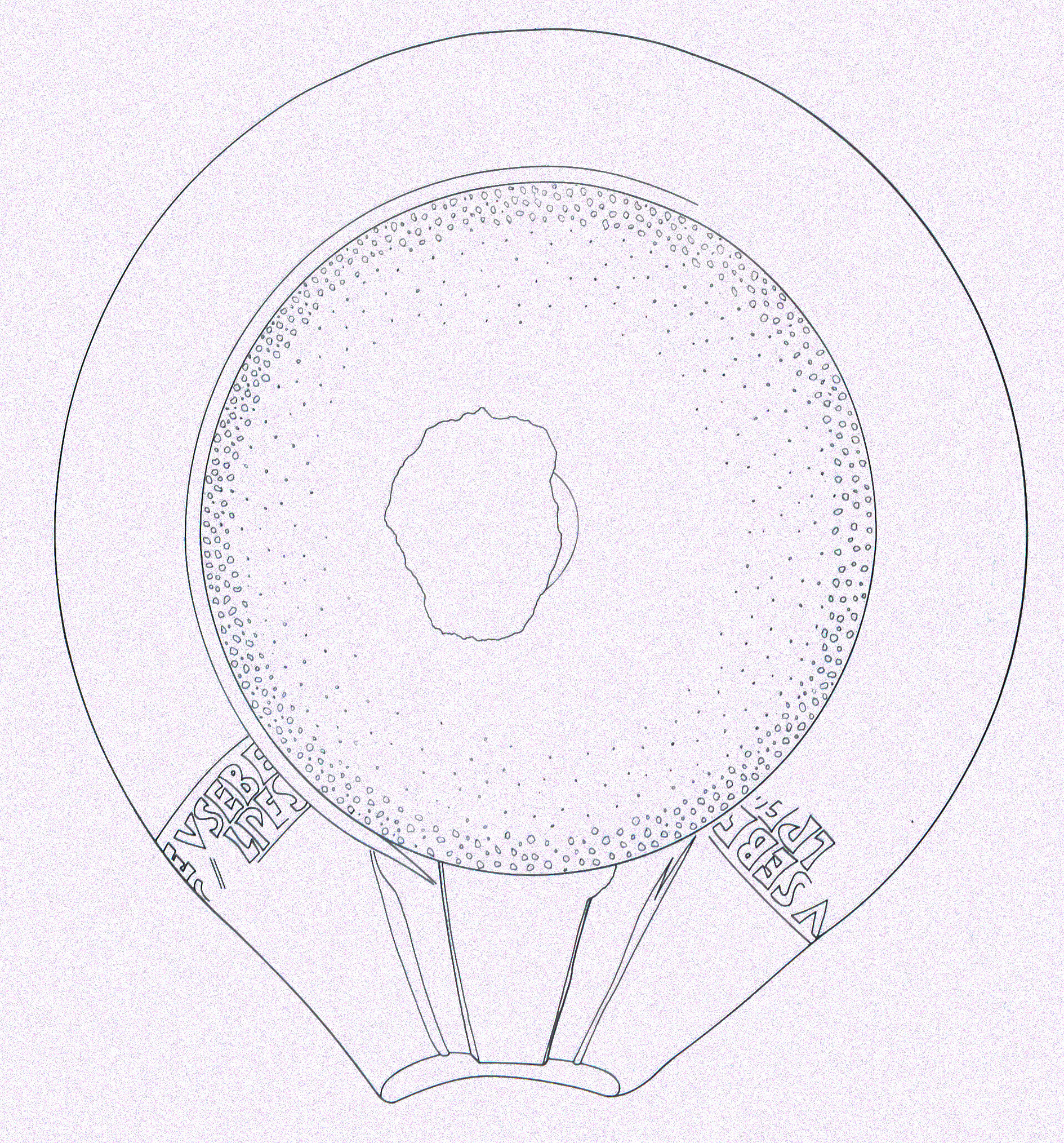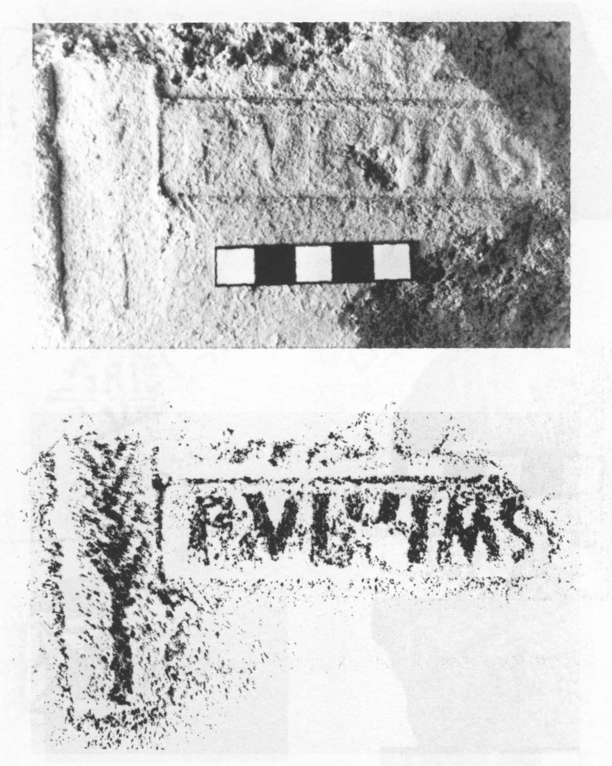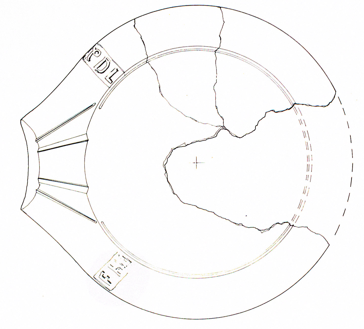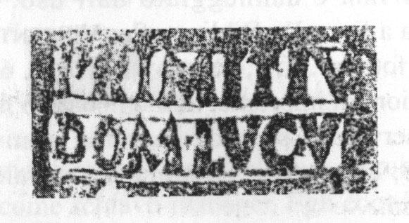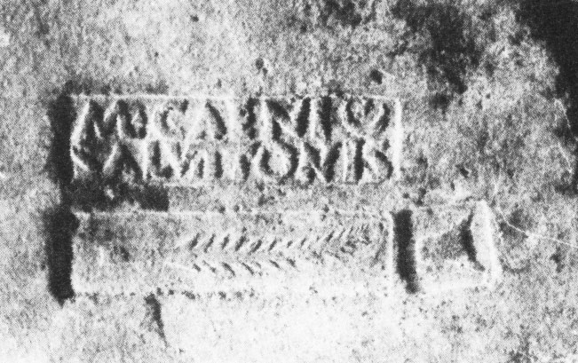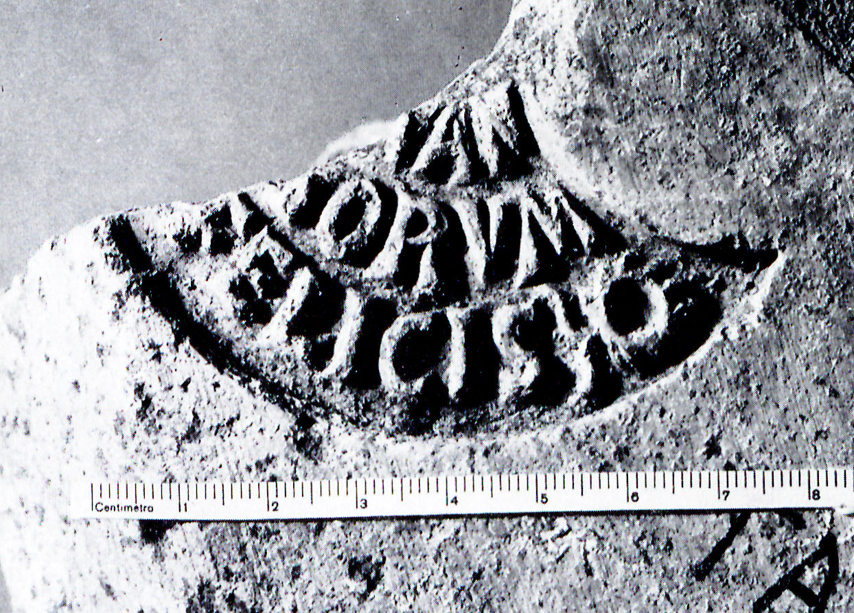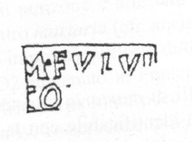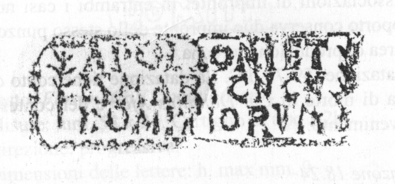 Commenti. Il labbro di dolio è stato smarrito. Rimangono dubbi sulla posizione del "ramo" che sormonta il testo (probabilmente un ramo di palma in bollo separato) e anche sulla prima lettera conservata, che forse è una M.