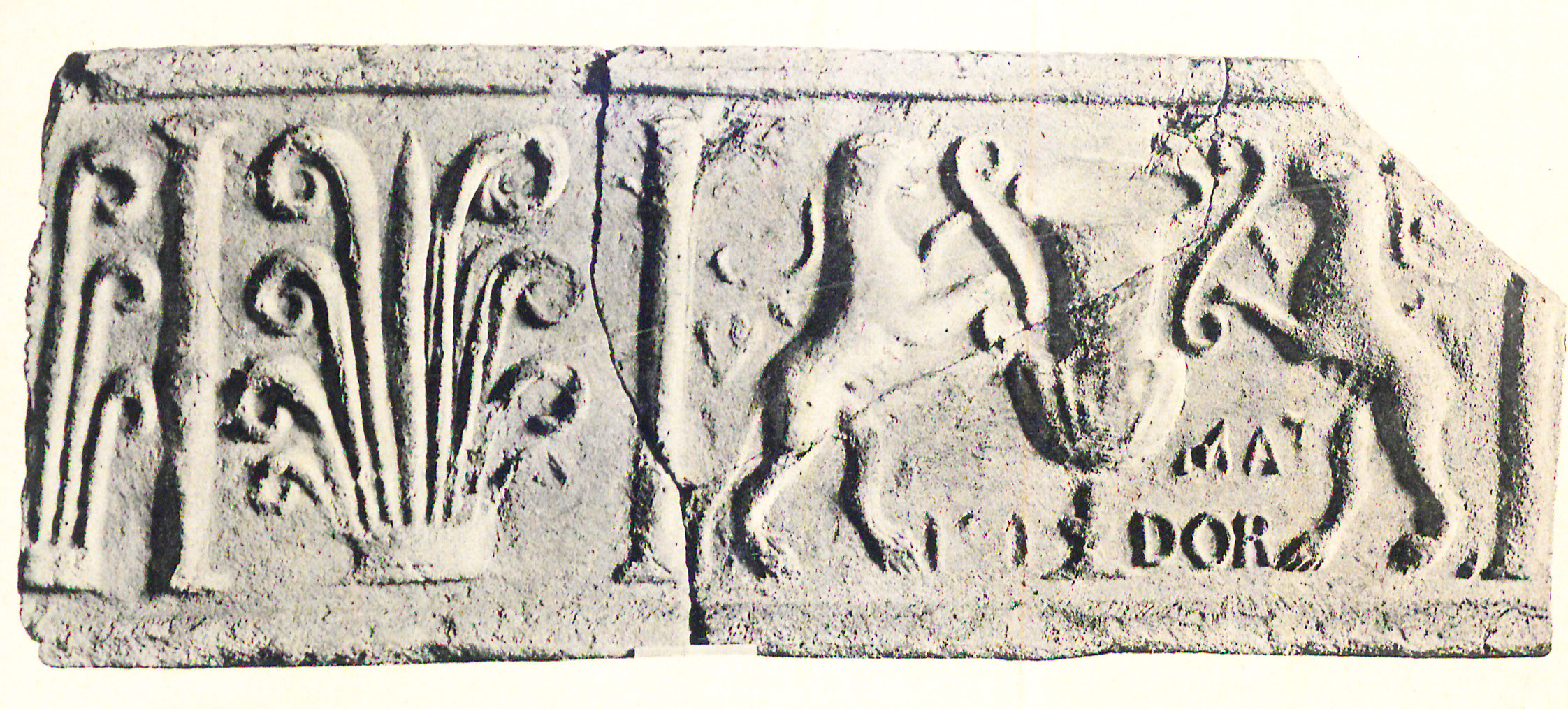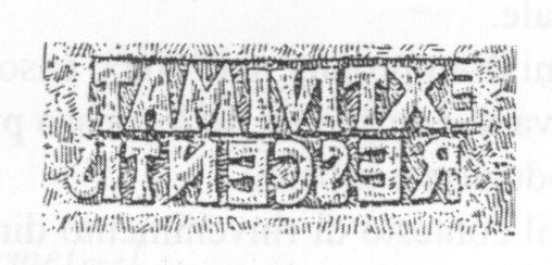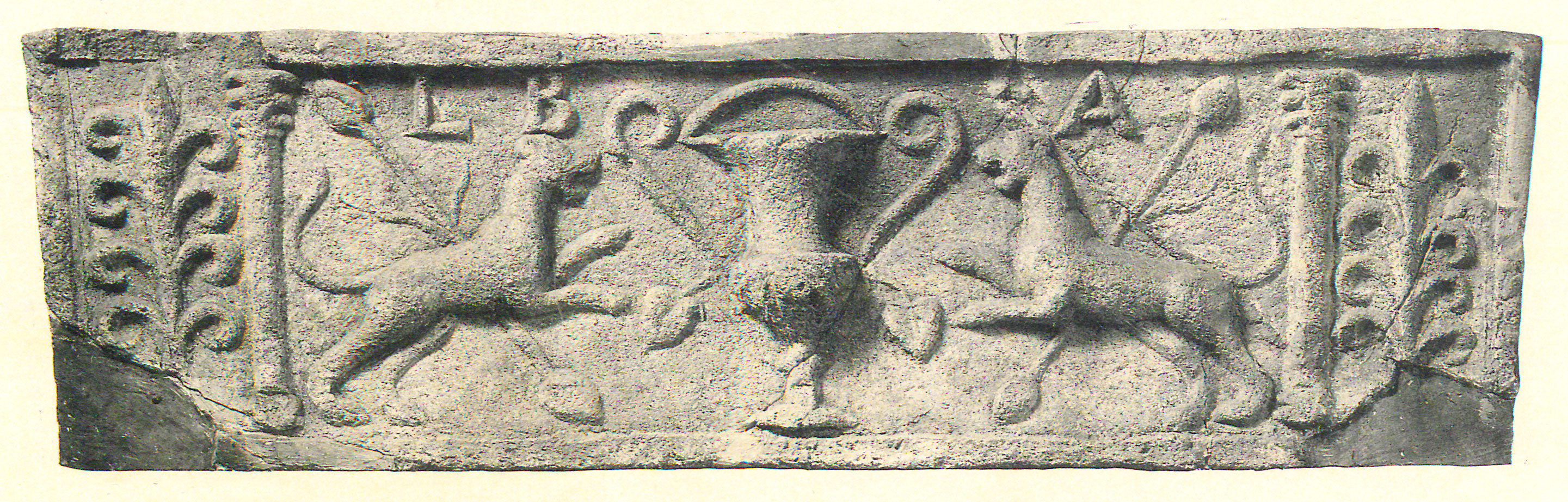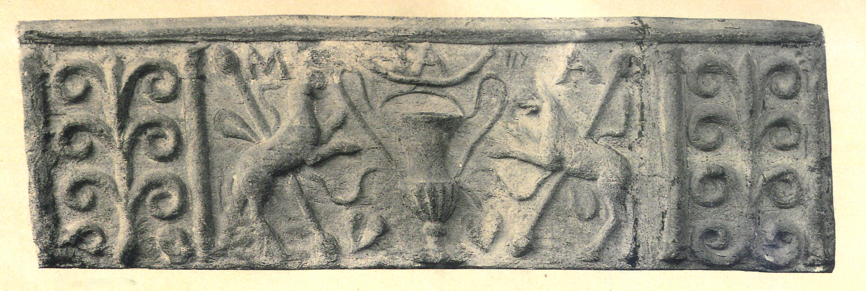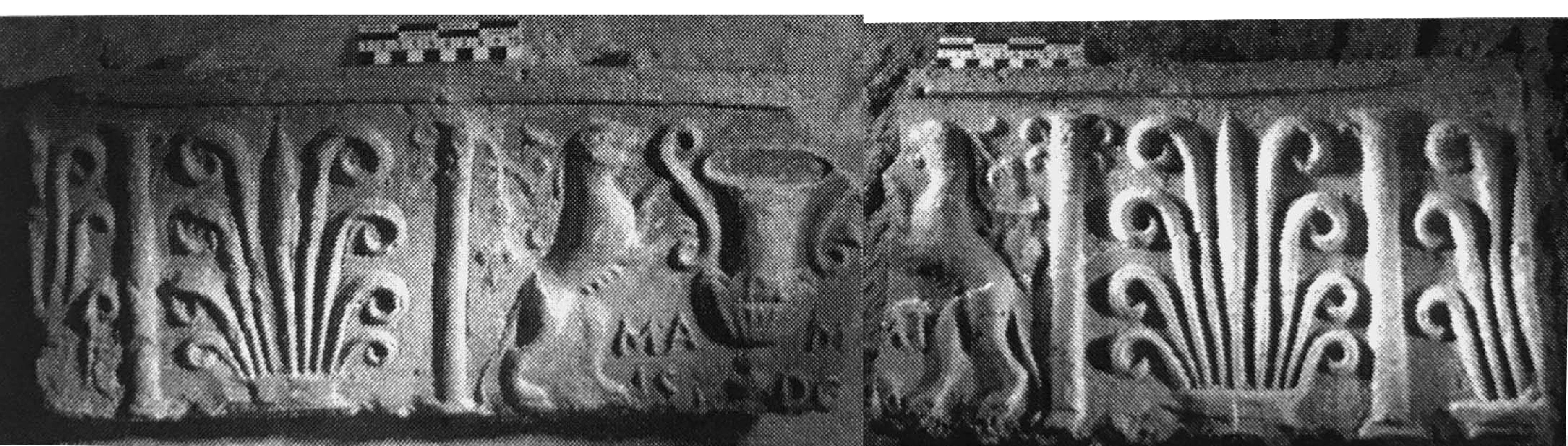 Paleografia. La lettera è stata accuratamente incisa nella matrice subito sotto il bordo della lastra, a fianco della cuspide del tirso della metà destra della scena (due pantere rampanti ai lati di un kantharos).