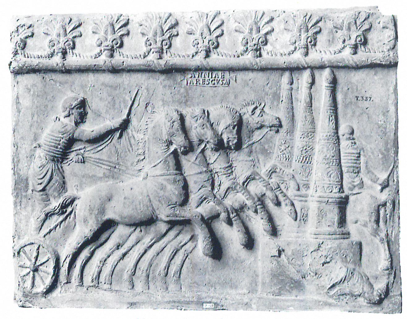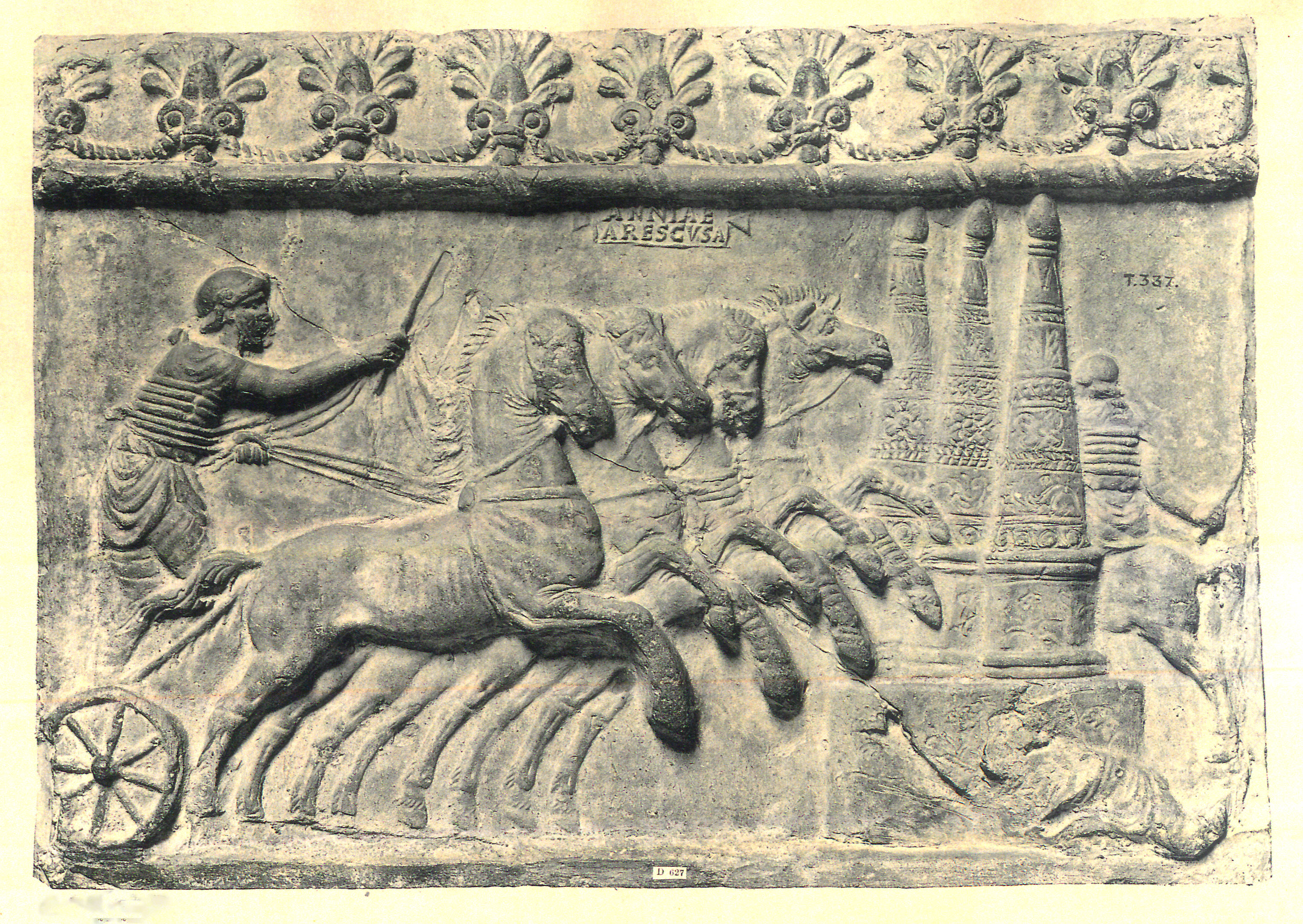 Edizioni. von Rohden - Winnefeld 1911, 21 tavv. LXXVI.1-2, LXXVII.2. Gli ess. del CIL sono stati schedati da Dressel e H. von Rohden; v. sopra. D. Vaglieri, NSc 1908, 140 fig. a p. 141 (Ostia, Antiquario), Tortorella 1981.1, 228 N. 25b. Rizzo 1976-77, 59, 62. Tortorella 1981.2, 68 e fig. 8 (la scena ripete gli elementi del soggetto a), ma la biga corre verso destra ed è preceduto da un satiro con pedum e seguita da Sileno). Tortorella 2024, 58 N. 34b.