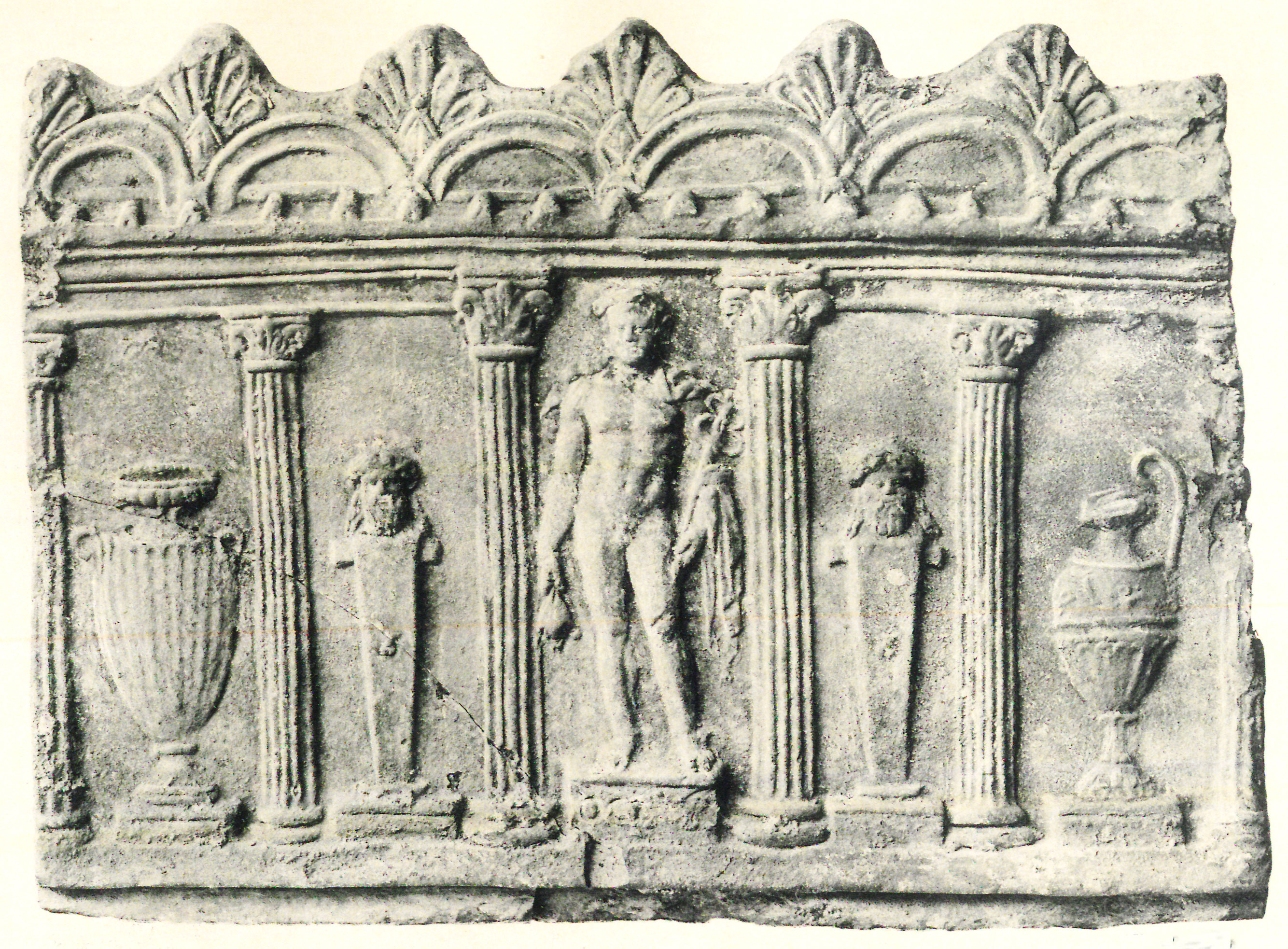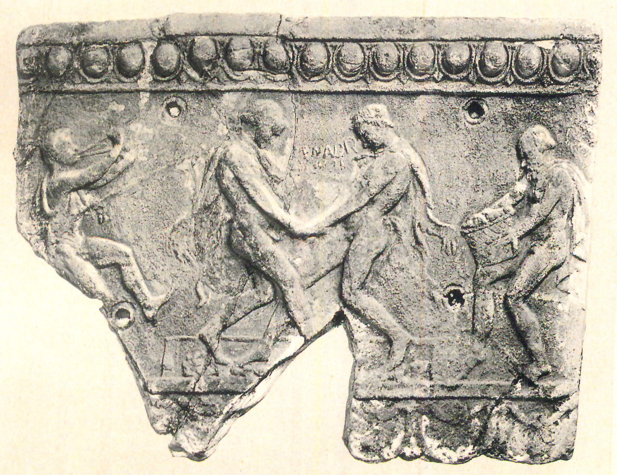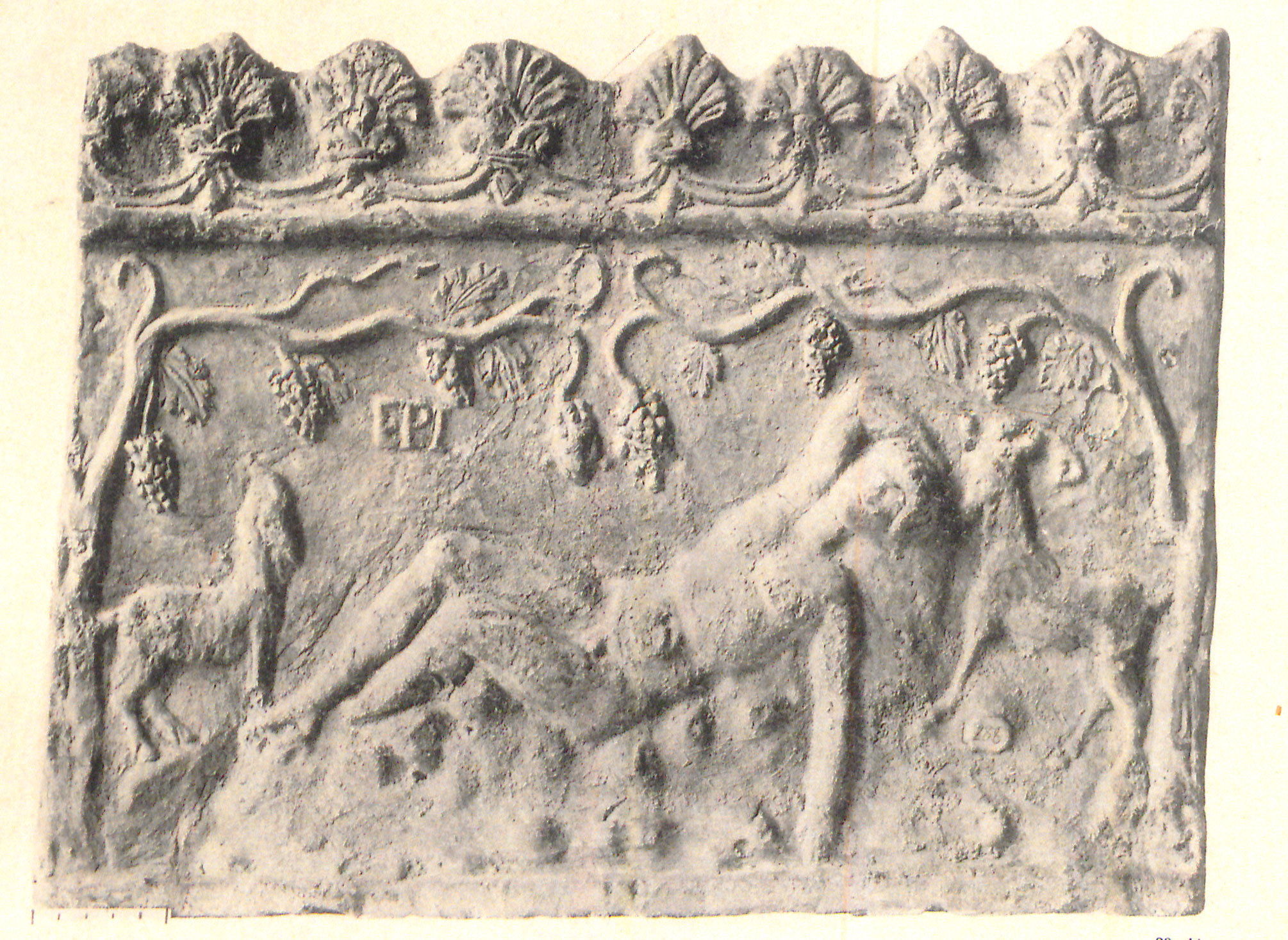 b) Pan, maenas, satyrus saltantes, a parte dextra mulier tibiis canens (von Rohden - Winnefeld 1911, 21 fig. 6). Cum his duobus laterculis a Campana componitur laterculus latior quam altior, in quo inter encarpa quernea est os Bacchi inter ora Panis et Sileni. Campana, Antiche opere in plastica, tav. XXXVI-XXXVIII (Parigi); Cataloghi del museo Campana, classe IV, 12 Nn. 254-259. Sia le lastre grandi che la più piccola sono timbrati.