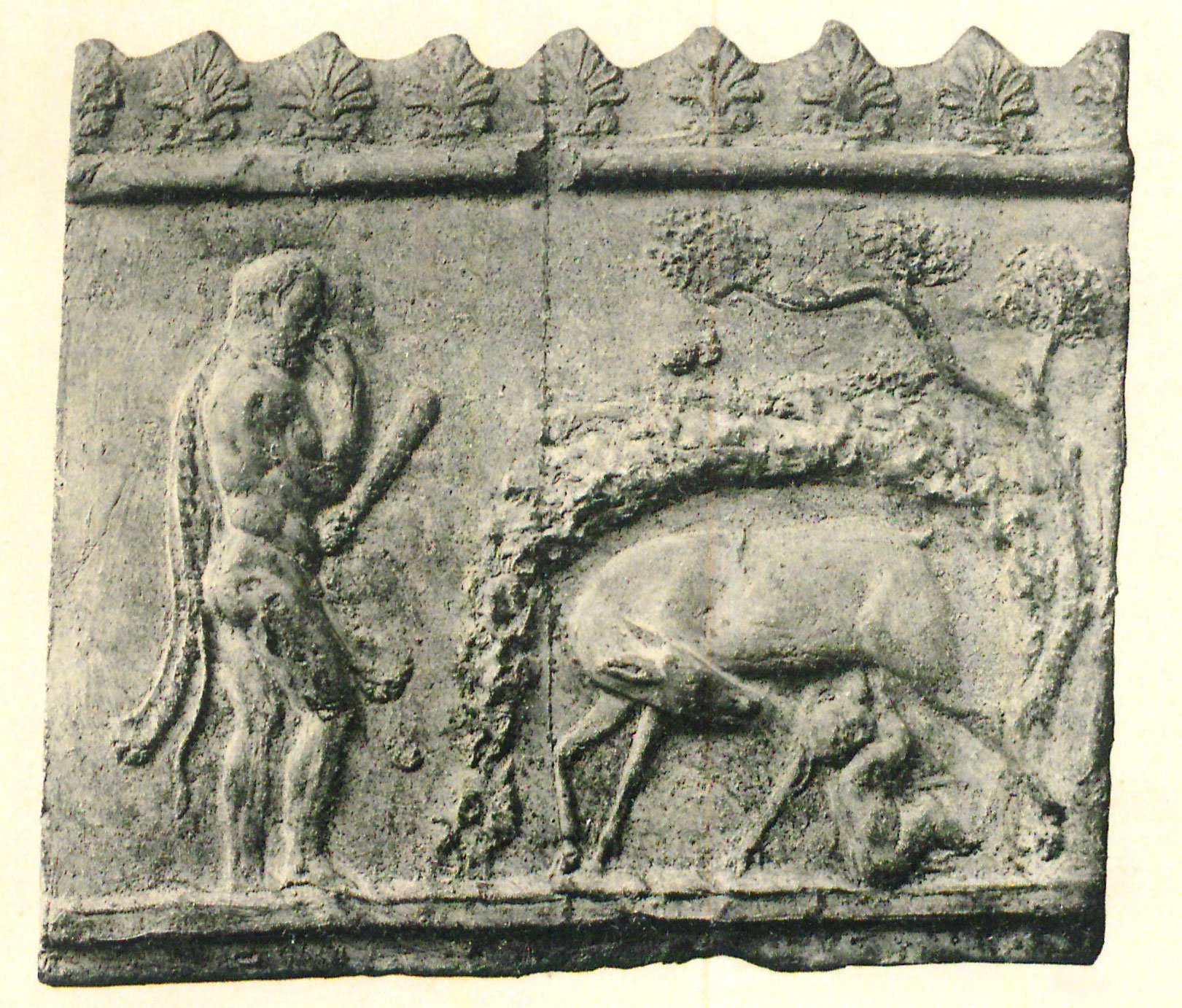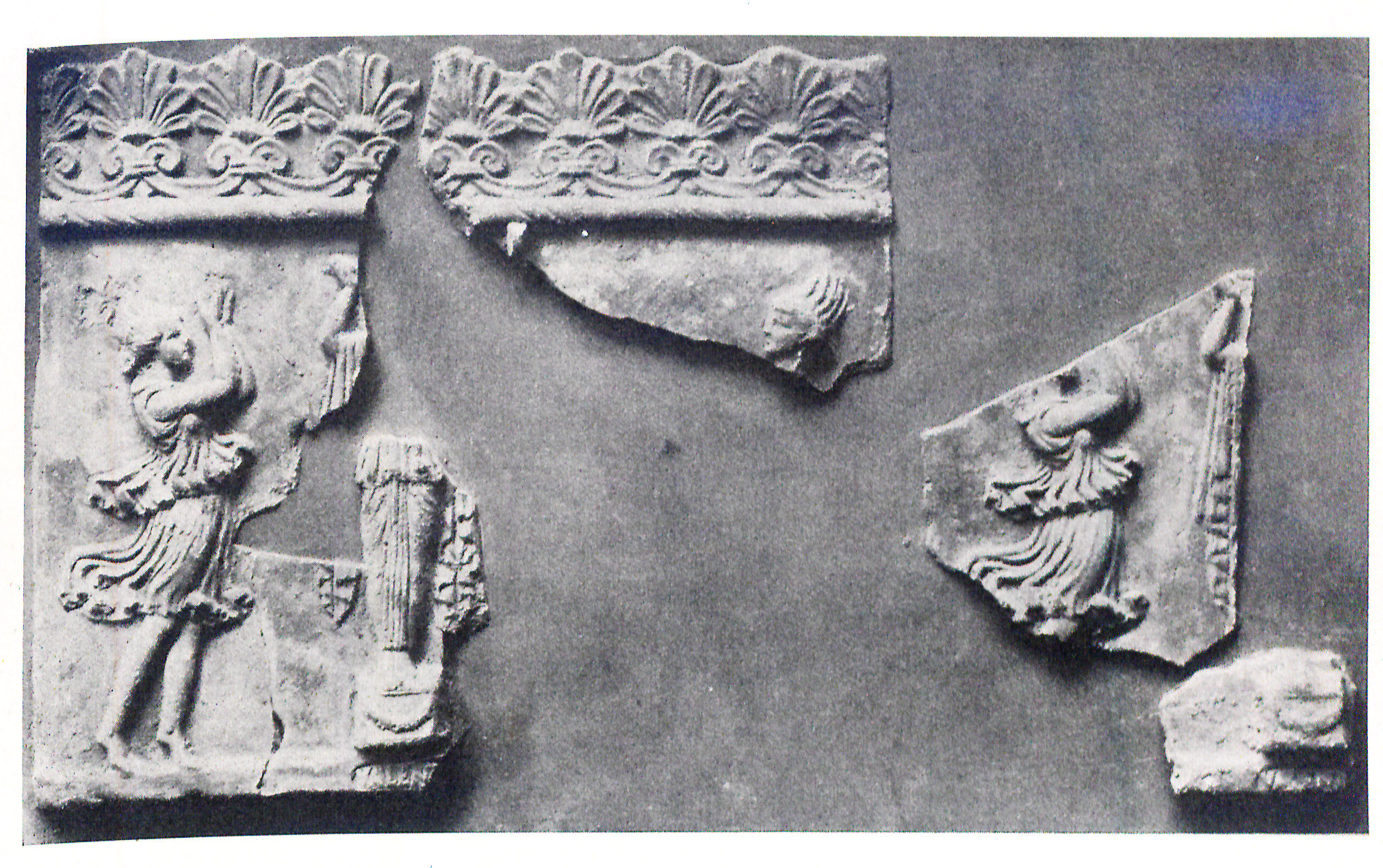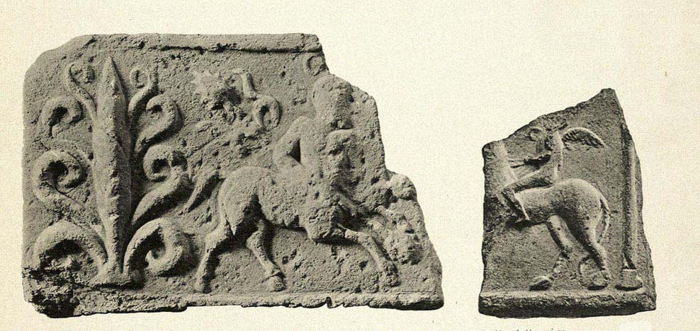 b) Pan, maenas, satyrus saltantes, a parte dextra mulier tibiis canens (von Rohden - Winnefeld 1911, 21 fig. 6). Cum his duobus laterculis a Campana componitur laterculus latior quam altior, in quo inter encarpa quernea est os Bacchi inter ora Panis et Sileni. Campana, Antiche opere in plastica, tav. XXXVI-XXXVIII (Parigi); Cataloghi del museo Campana, classe IV, 12 Nn. 254-259. Sia le lastre grandi che la più piccola sono timbrati.