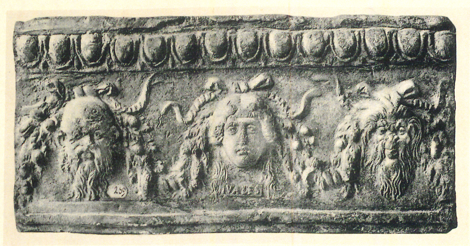 Edizioni. G.P. Campana, Antiche opere in plastica, 102 tav. XXV (inversum, FAVS pro FAXS). H. von Rohden (Parigi): "die rechte obere Ecke mit grossem Teil des Baums und den Buchstaben FAXS ist neu". Cfr. von Rohden - Winnefeld 1911, 19: "... wahrscheinlich die Teile mit der Inschrift ergänzt sind". Tortorella 1981.1, 228 N. 32 VERG[---]. Tortorella 2024, 58 N. 35 VERG FA['V]S[TVS].