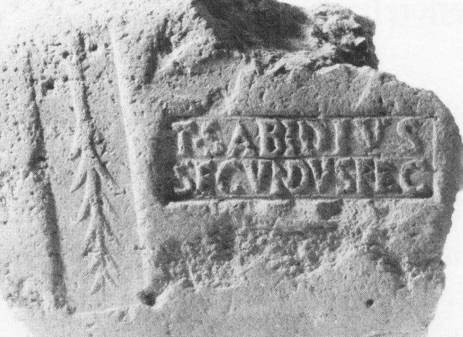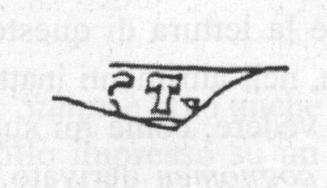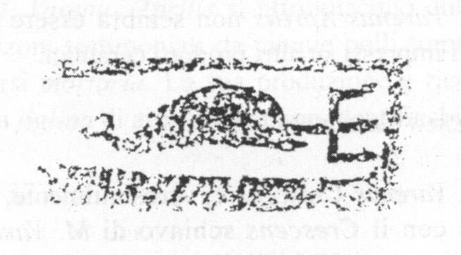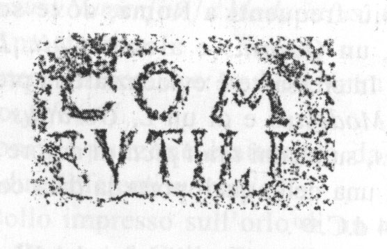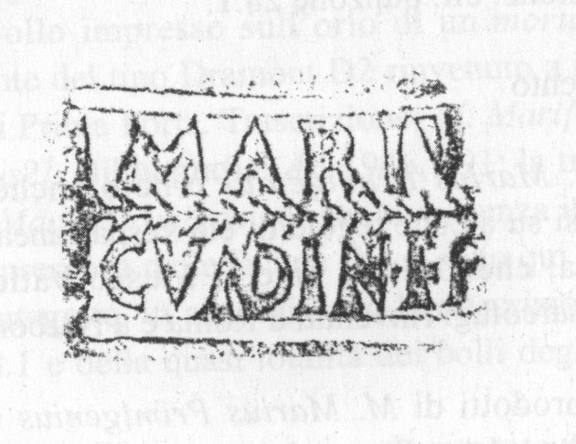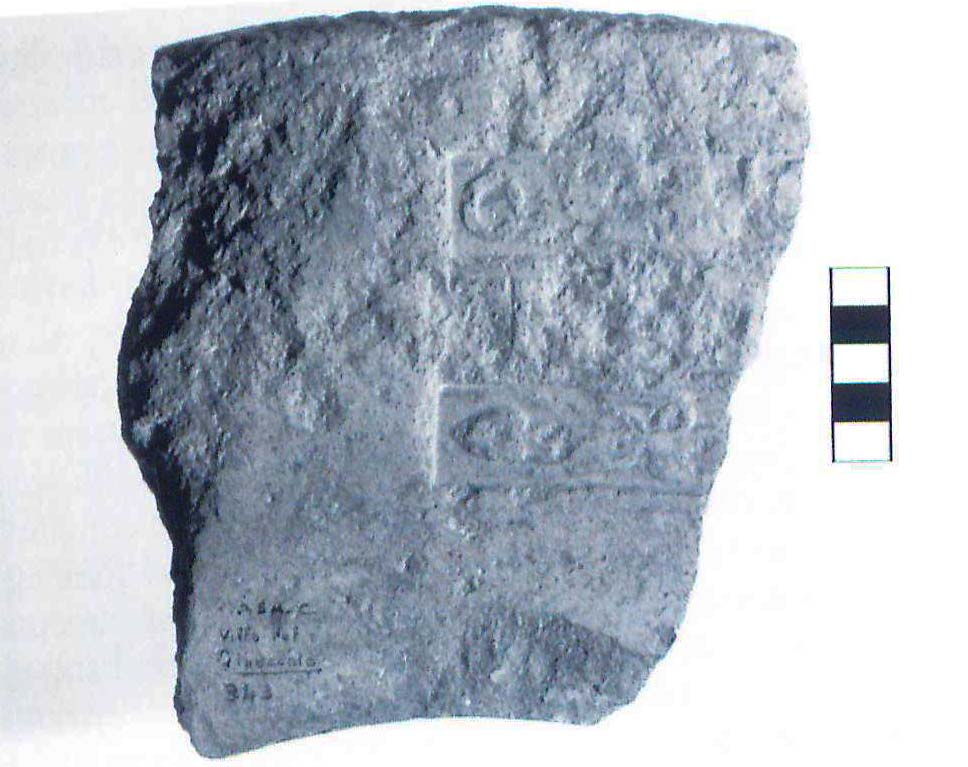 Commenti. La G non trova confronti nel nostro repertorio. Si tratta forse di un elemento di tria nomina abbreviati agli iniziali. S. Tortorella commenta: Il fatto che la lettera figuri a fianco della cuspide del tirso di destra farebbe pensare che si tratti dell'ultima lettera di tre: in questo caso [---]G, ma resta il dubbio.
