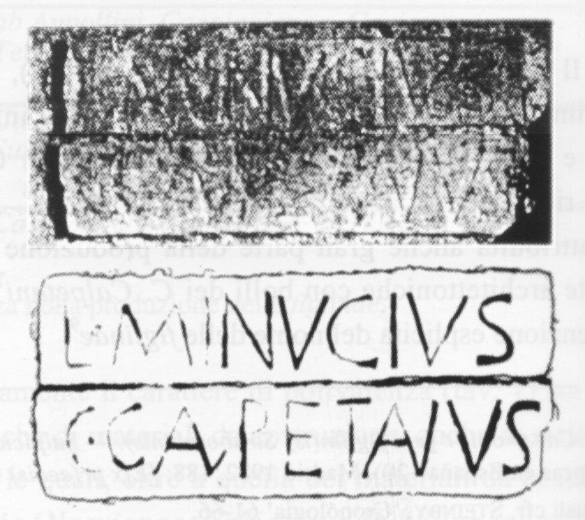 Edizioni. Immagine mandato a Dressel da A. Schoene e Villefosse (Parigi, mus. inv. 233). Menzionato a causa del tipo a lettere incavate in von Rohden - Winnefeld 1911, 21 n. 1. Tortorella 1981.1, 228 N. 31. Tortorella 2024, 58 N. 33.