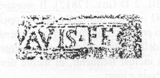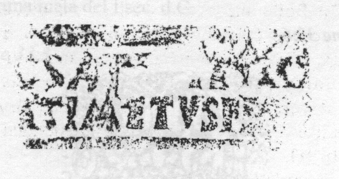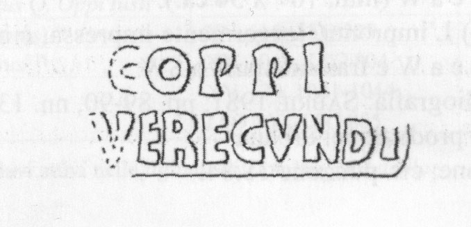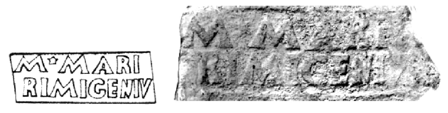 Edizioni. Hartley 1973, 53 N. 37 (m., Arles). Fernández Izquierdo 1980, 181 N. 1, fig. 12 a p. 180. J.M. Blásquez Martínez, in Producción y comercio del aceite en la Antigüedad. Secundo Congreso Internacional II. Universidad Complutense. Madrid 1983, 75 fig. 24 da J. Blásquez; Ramos - Wagner - Fernandez 1984, 153 e fig. 13a a p. 150, tav. II.2; Pérez González - Fernández Ibánez 1989, 80 N. 15, fig. 15; Parker 1992, 71 N. 98 (m., relitto Ben Alfeli, Almazora). Hartley 1973, 52 N. 38; Ramos - Wagner - Fernandez 1984, 158 (m., Nijmegen). Pallecchi 2002, 181 punzone 21.1 Nn. 226, 227a/b, 228; 294 N. 461 (m., Saint-Raphaël; Brentchaloff - Rivet 2000, 496s., 500 N. 16 con lettura fantasiosa). Aguarod Otal 2022, 334 Nn. 40-41, fig. 8.40-41.