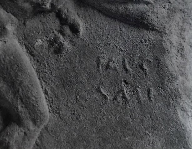 Commenti. La lastra proviene da Populonia, ma le approfondite indagini di Shepherd non sono risultate in una precisazione del luogo di rinvenimento (Shepherd 2019, 110s.). Da Populonia proviene anche la lastra di Menander. Le lastre di Faustus e di Menander hanno dimensioni e impasti simili e sono quasi sovrapponibili (Shepherd 2019, 111 n. 67); la lastra di Faustus è tratta da una matrice molto stanca, o è ricavata dal calco di un'altra lastra (Shepherd).