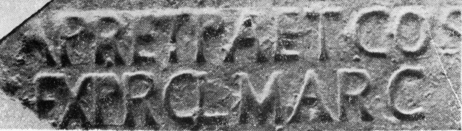 Commenti. La fotografia è poco chiara; non è certo che tutto il testo sia conservato come farebbe capire la trascrizione di Veny. Rimane incerta anche l'interpretazione, fra T. come prenome e come abbreviazione di t(egula); quest'ultima proposta permetterebbe di identificare il personaggio con il sopra citato officinatore di M. Annius Verus.